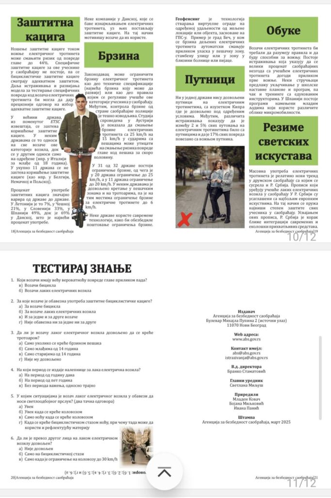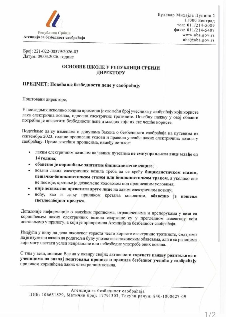 У складу са дописом Агенције за безбедност саобраћаја, обавештавамо родитеље и ученике о важним правилима приликом коришћења лаких електричних возила – електричних тротинета.