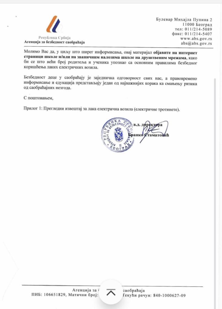 Позивамо родитеље и ученике да се упознају са садржајем дописа и да заједно допринесемо већој безбедности деце у саобраћају.